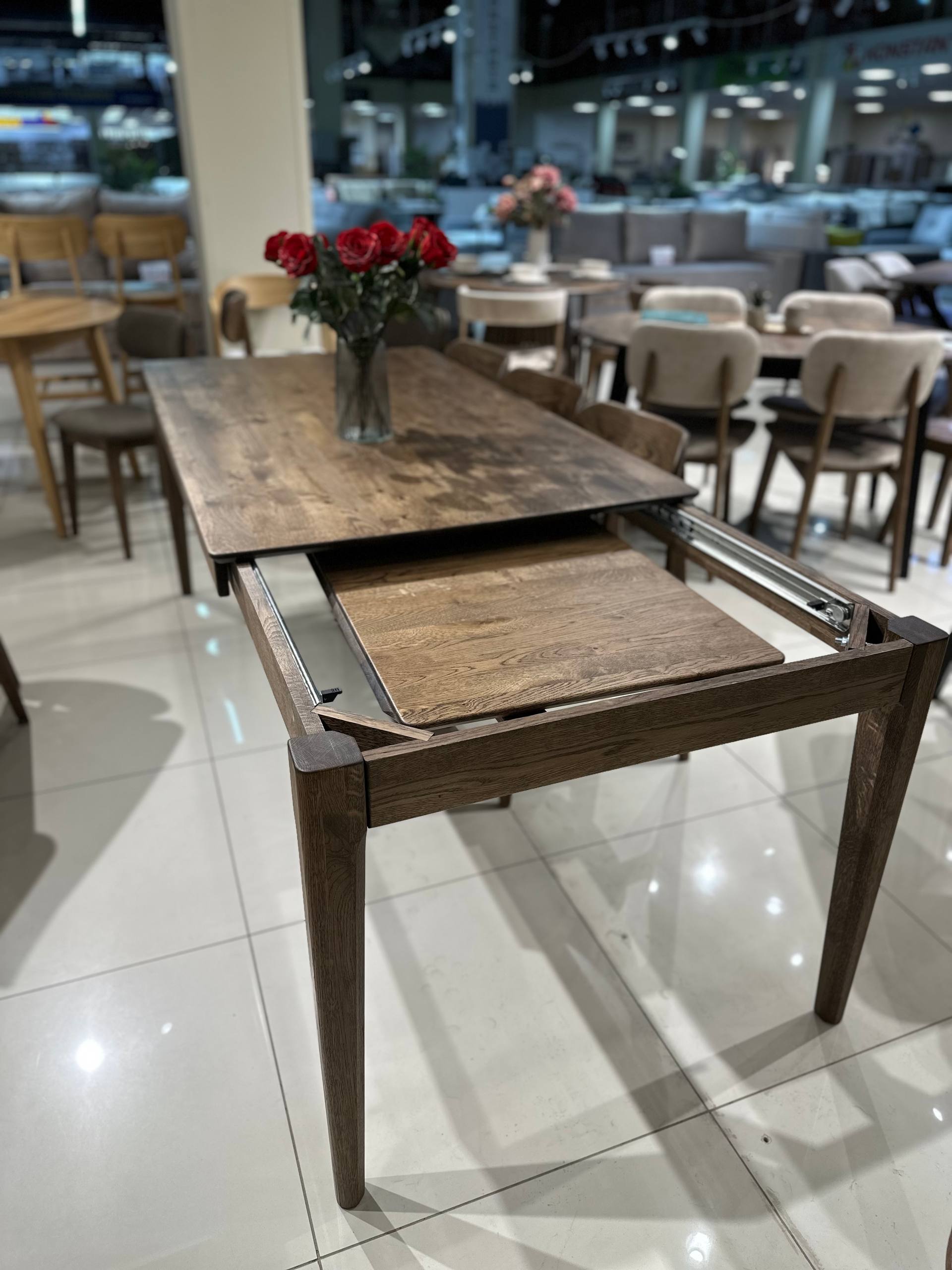 Дубовий стіл з надійною конструкцією та витонченим дизайном стане ключовим атрибутом вашої оселі. Стіл збільшується за допомогою бокової вставки, яка зберігається під стільницею