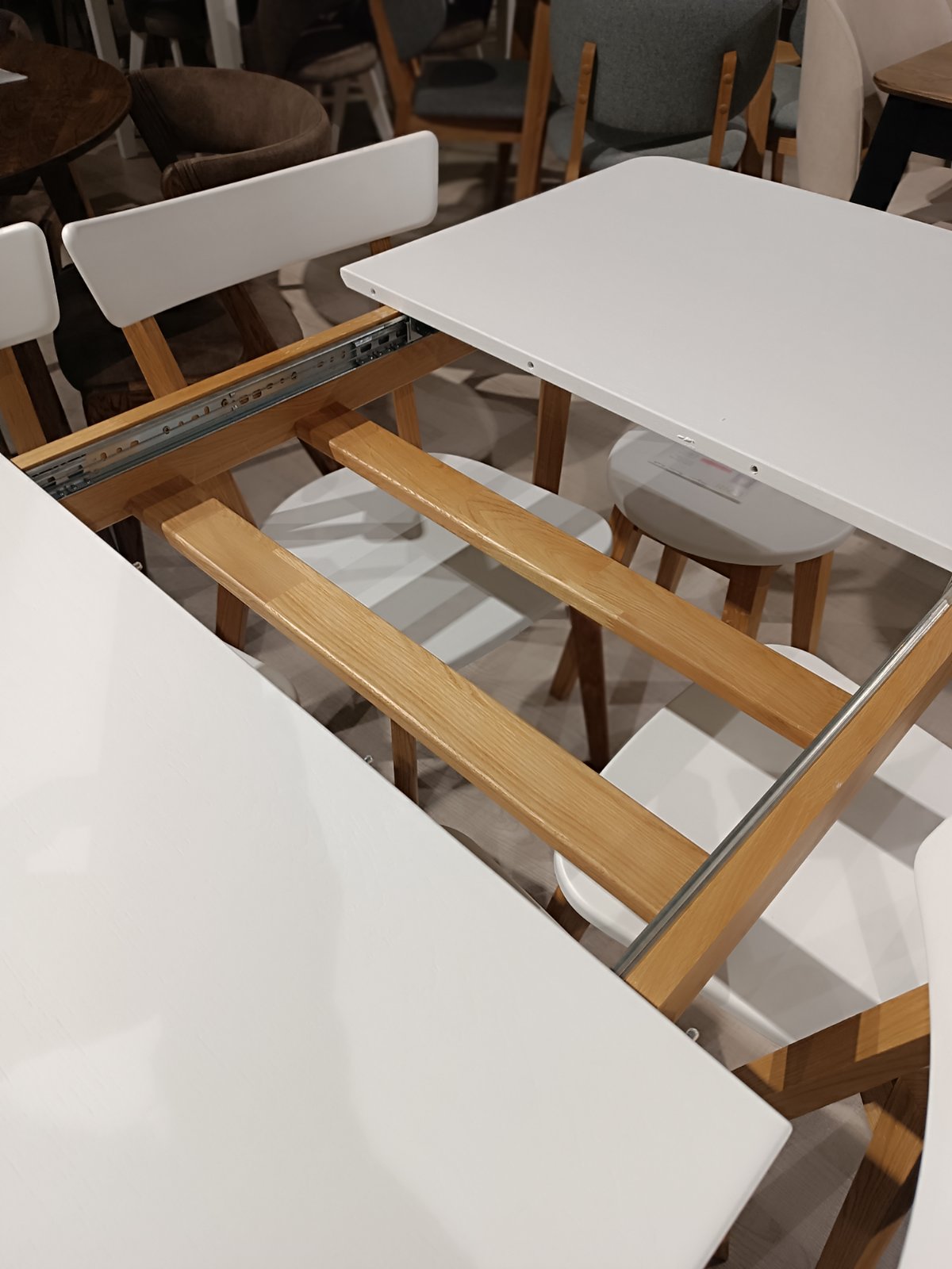 Стіл із натурального дерева «Мері» виготовлений із дубового масиву. Конструкція дає змогу збільшувати довжину стільниці завдяки центральній вставці, яка зберігається під стільницею