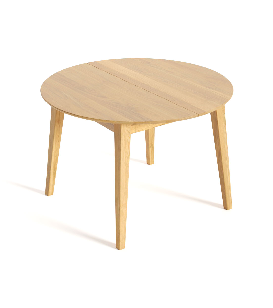 Кругла стільниця за допомогою вставки трансформується в овал. У складеному вигляді вставка не кріпиться під стільницею, а зберігається окремо. Товщина стільниці – 20 мм, по краю виконана радіусна фаска. До замовлення доступні три розміри: